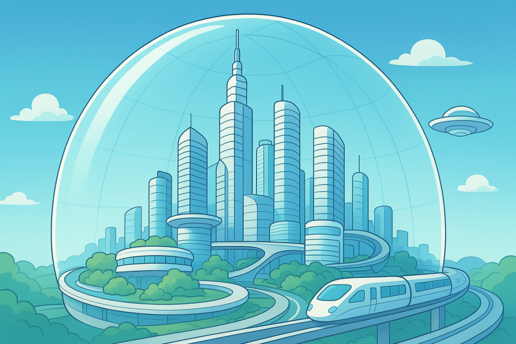 この時代に描かれた都市が未来ですが、ドームが無ければほぼ今と変わりのない姿です。なので私の想像はドラえもんまでで都市計画は出来そうにないです。